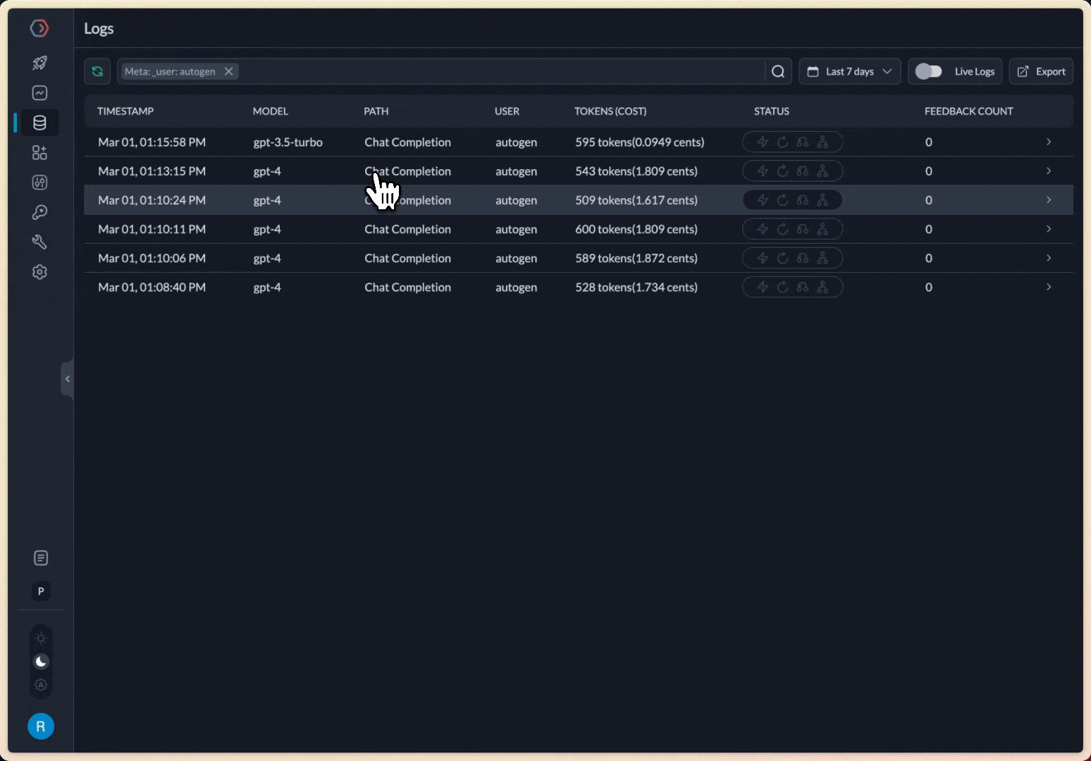 When we execute this script, it would yield the same results as without Portkey, but every request can now be inspected in the Portkey Analytics & Logs UI - including token, cost, accuracy calculations.